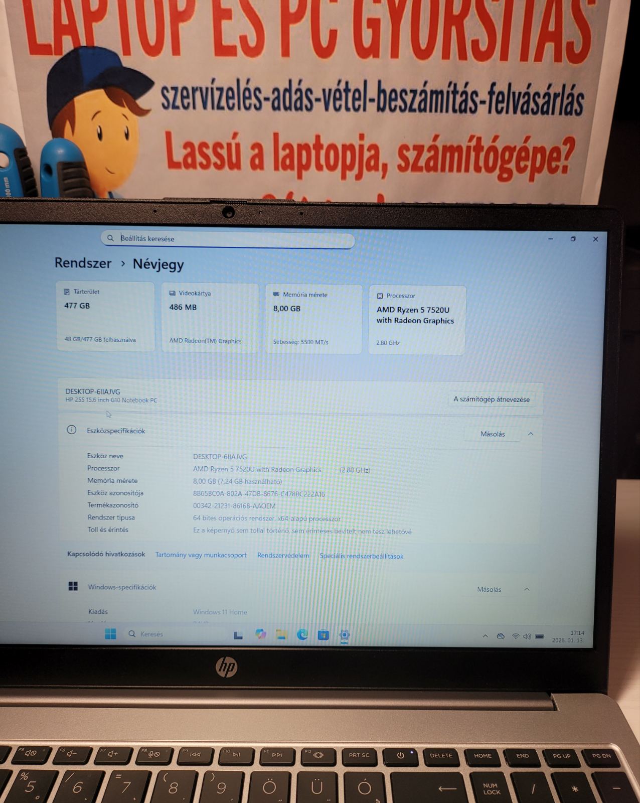 Gyári garancia, szép állapot, erős AMD Ryzen 5 7520u processzor, 8GB DDR5 memória, 512GB NVME tárhely, Windows 11 és Office, leszervizelve, kitakarítva, feltelepítve, használatra készen.